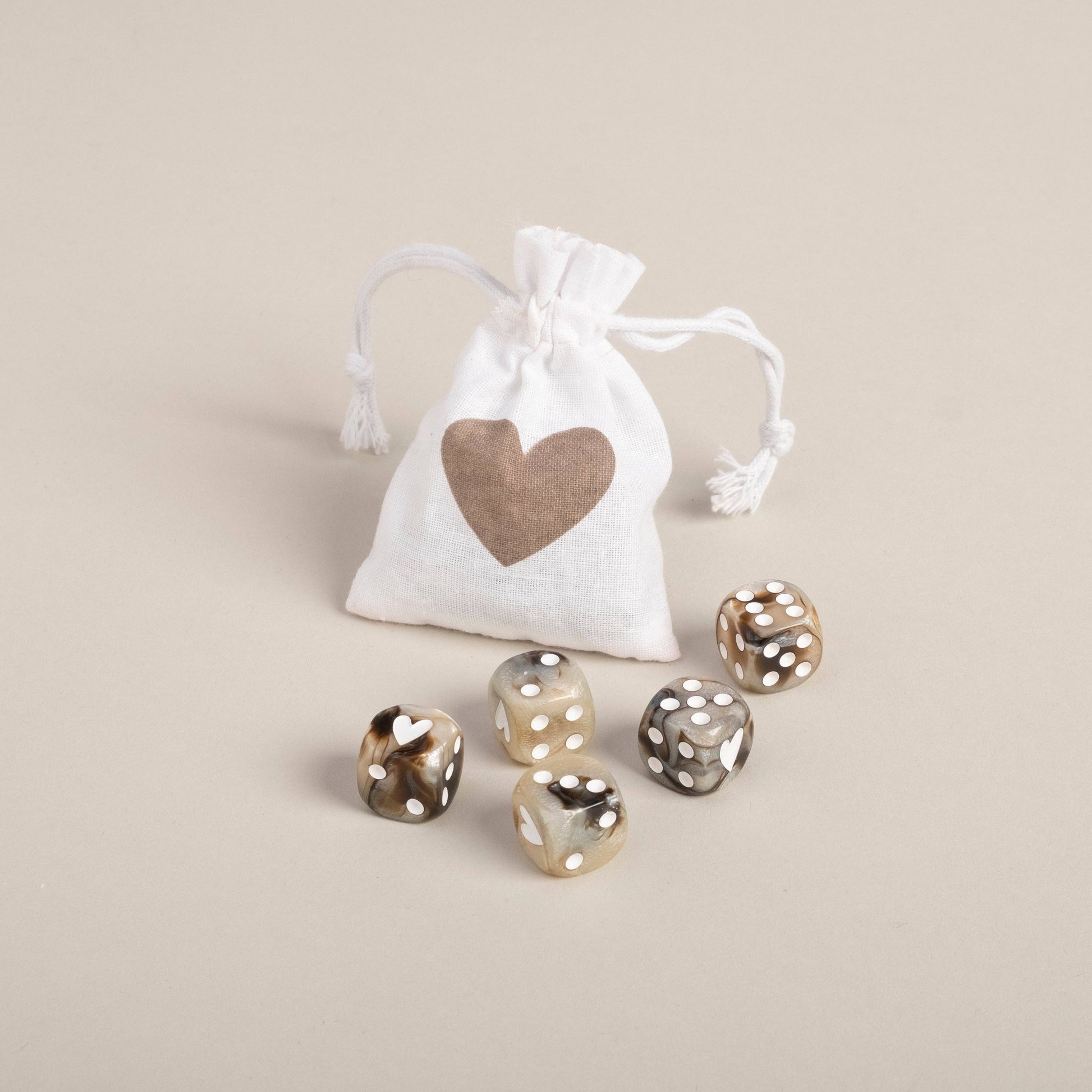 De charmante hartjes die de één op elke dobbelsteen sieren, maken ze echt een blikvanger. En het beste is: met het meegeleverde stoffen zakje met hartjesprint zijn de dobbelstenen altijd binnen handbereik en perfect voor onderweg.
