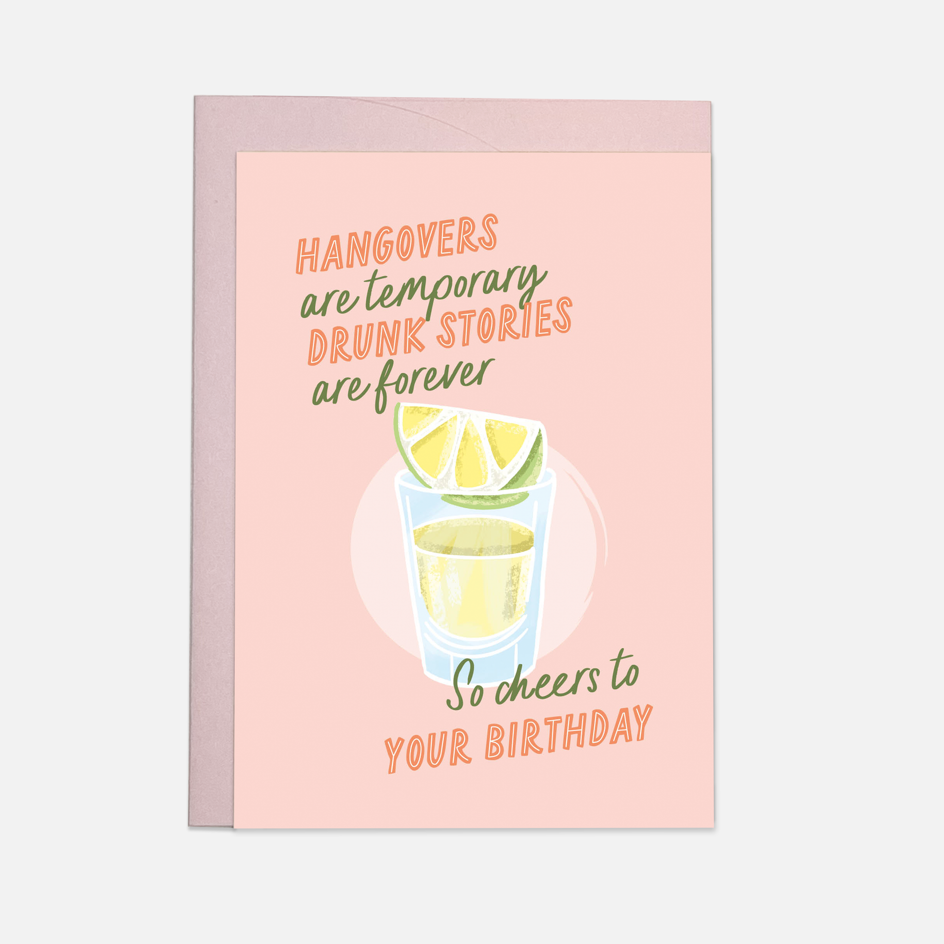 Send your love, friends, family or dog an original greeting card and surprise someone with this ‘Hangovers are temporary, drunk stories are forever – so cheers to your birthday‘ card.