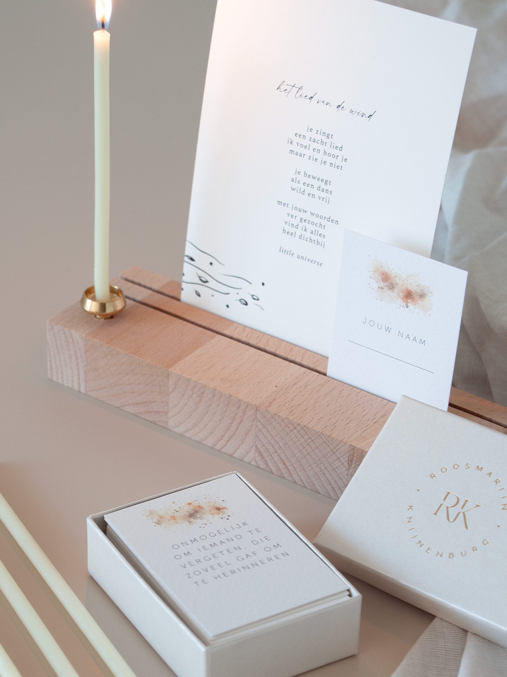 Een houvast voor dat ene aandenken waar jij waarde aan hecht. Het pakket bestaande uit de houder, messing houdertje, 31 kaartjes in een mooi doosje en vier bijenwaskaarsjes zitten mooi verpakt in een kartonnen koker. Er past ook een wierook kegeltje in de messing houder! Brand de heerlijke Palo Santo voor wat extra rust.
