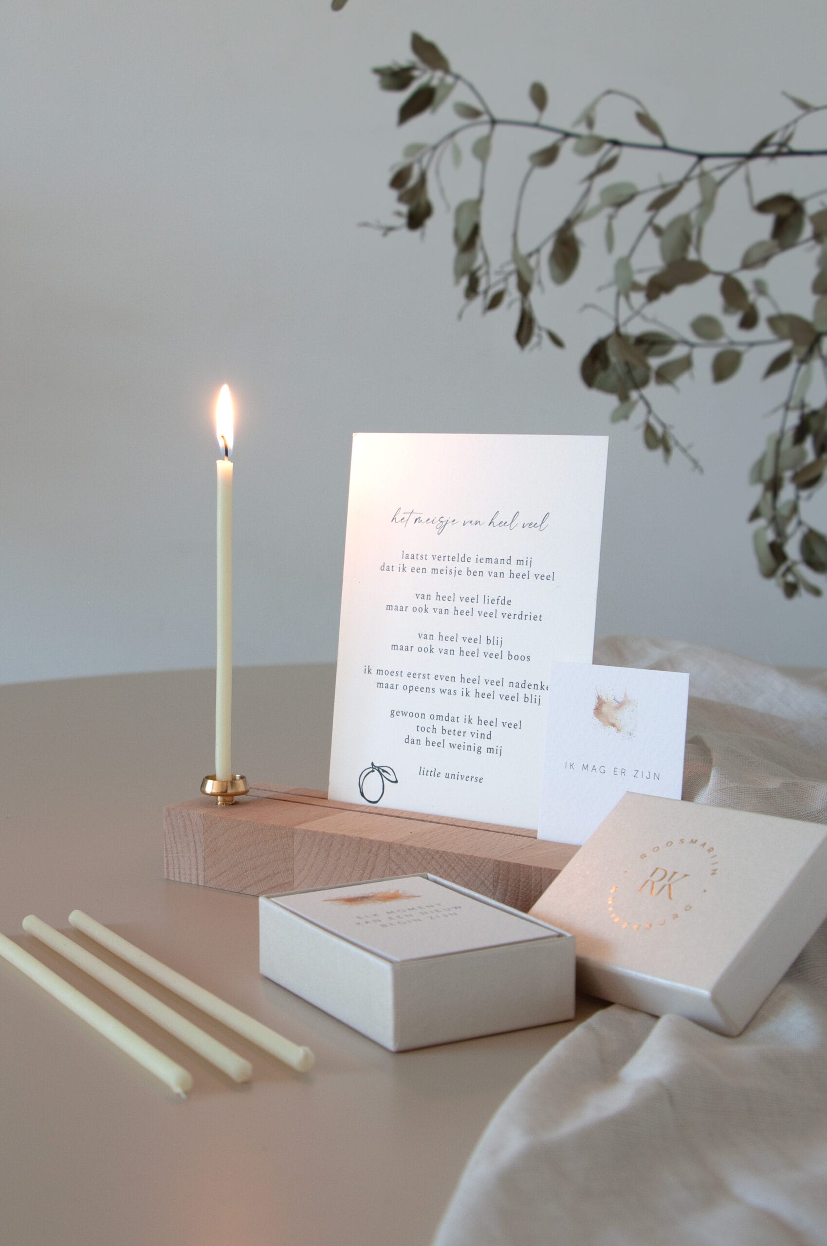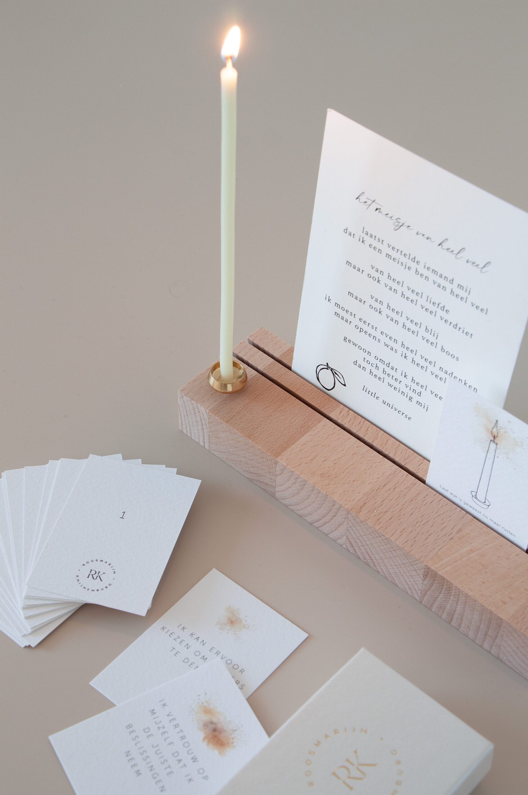 B 20 cm x H 2,7 cm x D 5,5 cm / beuken / mindful doosje met 31 kaartjes / messing houder + 4 bijenwaskaarsjes