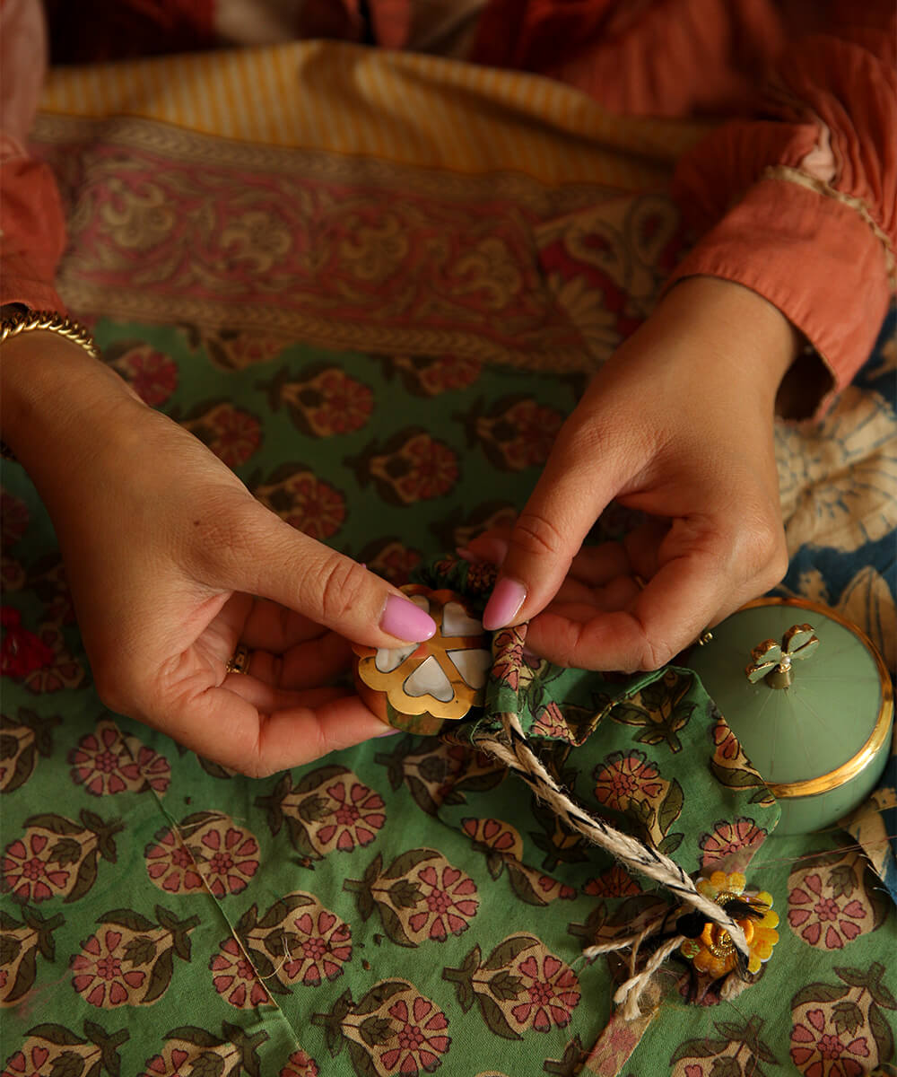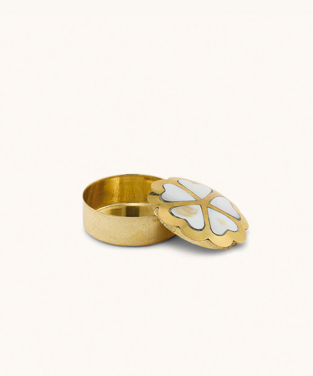 Store your little lovelies in the Honey Heart Box Small. Tuck your tiny treasures into the loving embrace of this enchanting little jewellery box, expertly handcrafted in India from natural shell and recycled brass. Featuring heart-shaped designs that are both symbolic and decorative, this box is more than just a storage solution; it’s a statement of love and environmental consciousness.