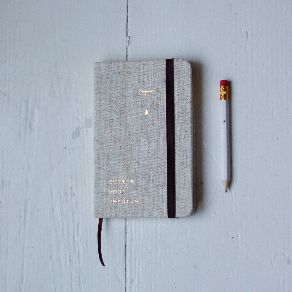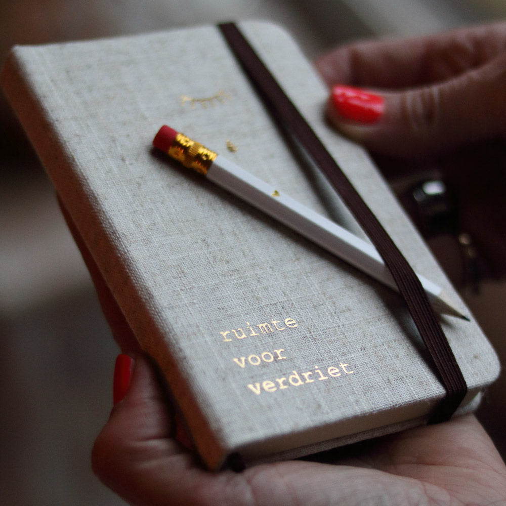 Geef ruimte en woorden aan verdriet met dit lieve notitieboekje. Uitgevoerd met een harde linnen kaft met een mooie gouden opdruk ‘ruimte voor verdriet’ en een gouden oogje met een traan. Het notitieboekje is A6 formaat en gelinieerd. Daarnaast heeft het boekje een bruin lintje als bladwijzer, een lief hartjes paperclipje en een elastiek om het dicht te houden. Het bijgevoegde potloodje met een klein gouden hartje maakt het compleet.