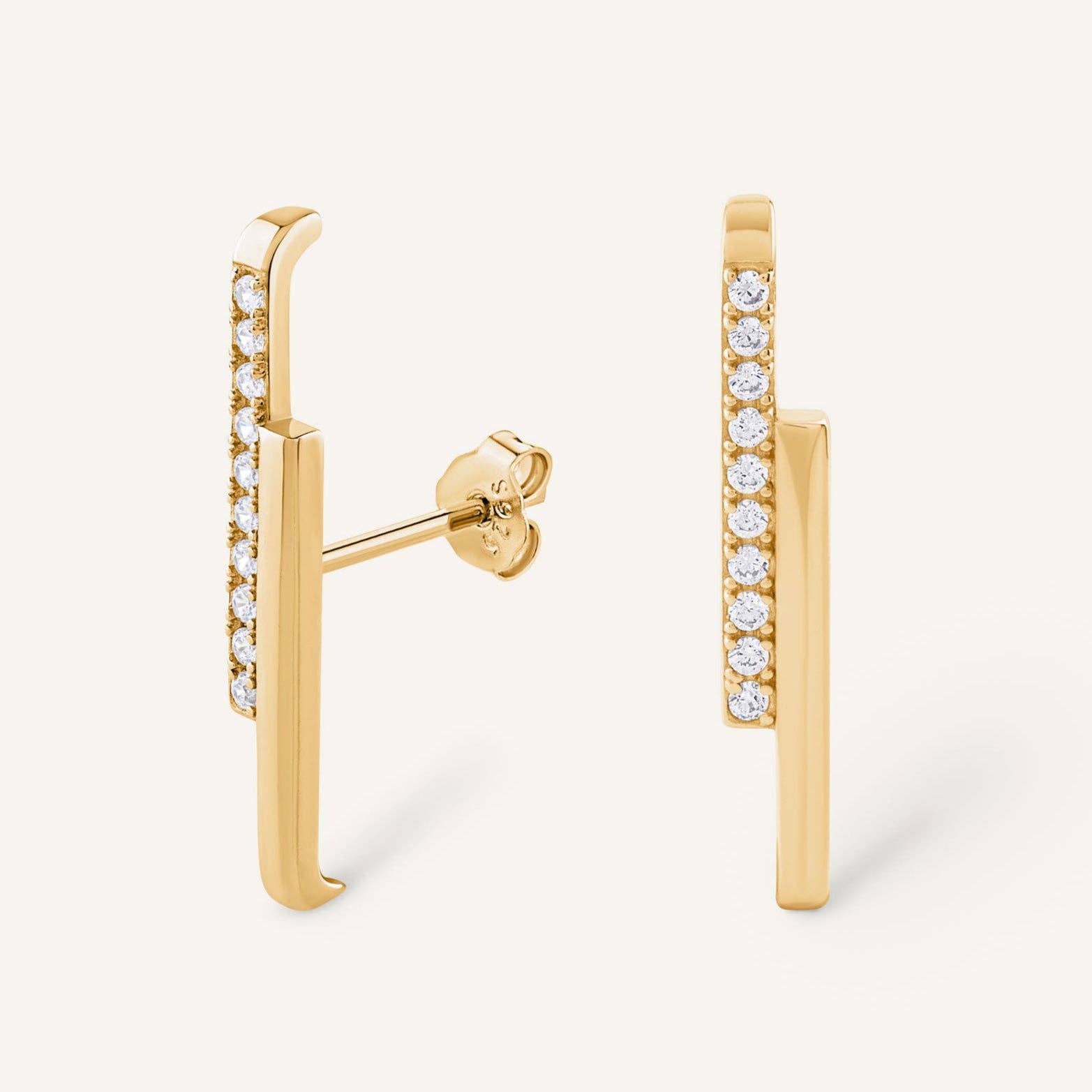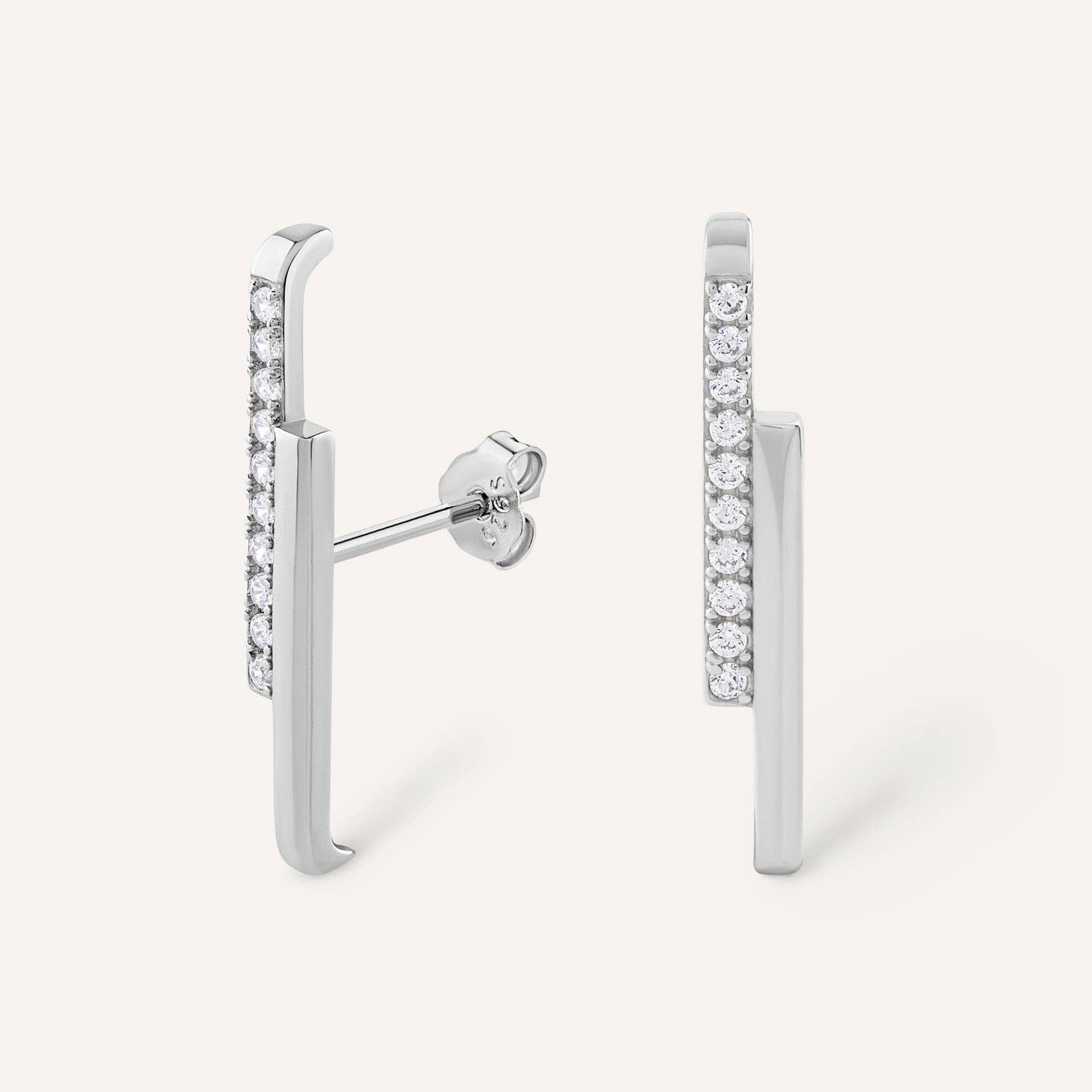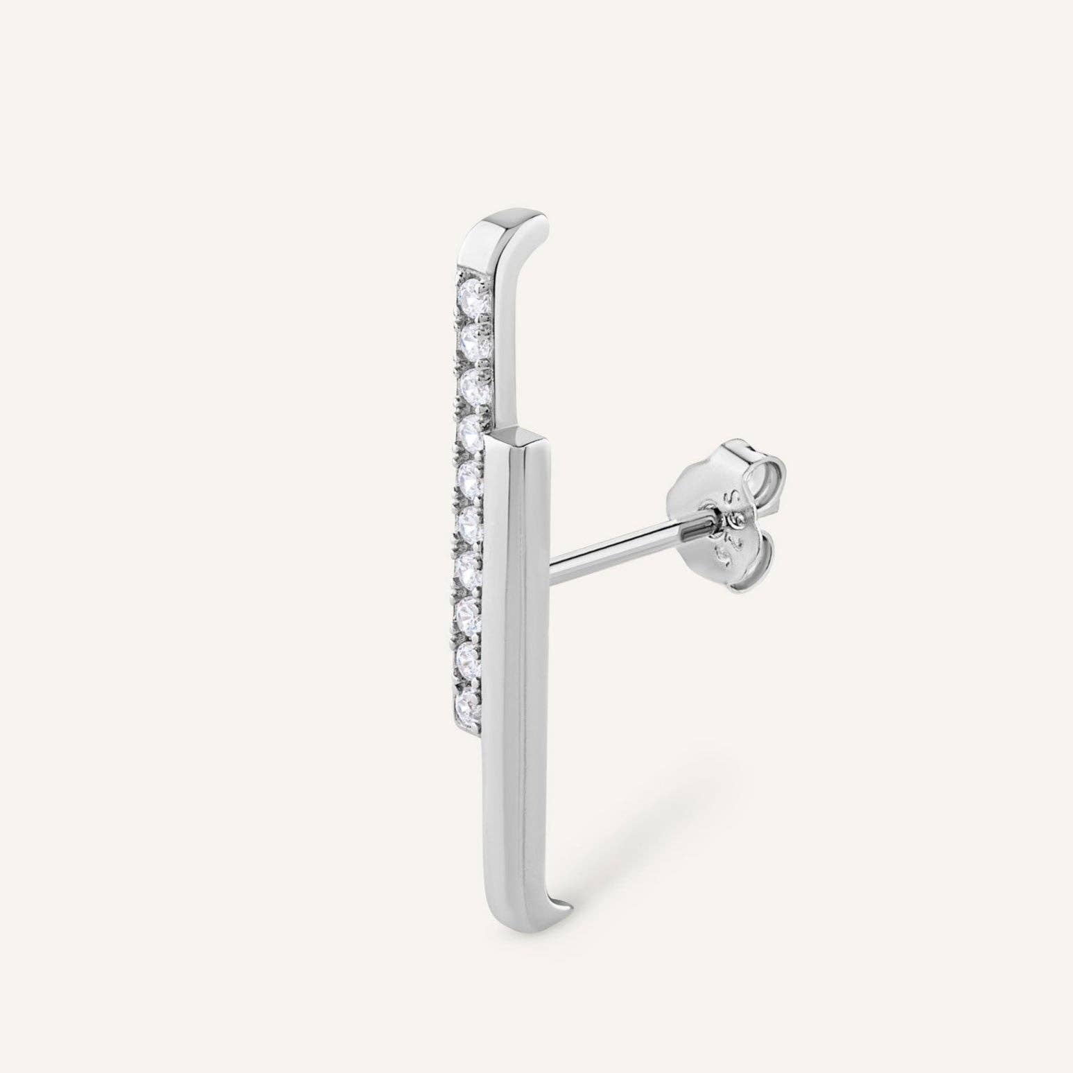 925 zilveren staaf verguld met 24-karaats goud, bezet met stralende stenen. Een grafisch en verfijnd ontwerp dat de oorlel elegant siert.