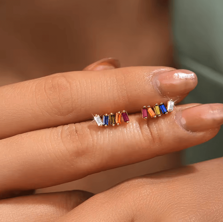 Voeg een vleugje kleur toe met Solara EARRINGS. Deze oorbellen zijn gemaakt van sterling zilveren studs en levendige zirkonia en zijn het perfecte accessoire voor elke outfit. Schitter helder met Solara!