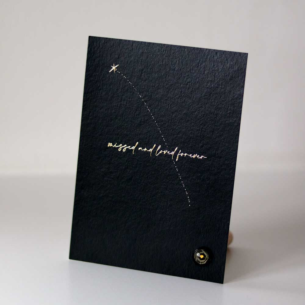 Troostkaart MISSED in zwart met goudfolie is speciaal ontworpen om iemand een hart onder de riem te sturen in moeilijke tijden. Op de kaart staat de tekst ‘missed and loved forever’ in goudfolie.
